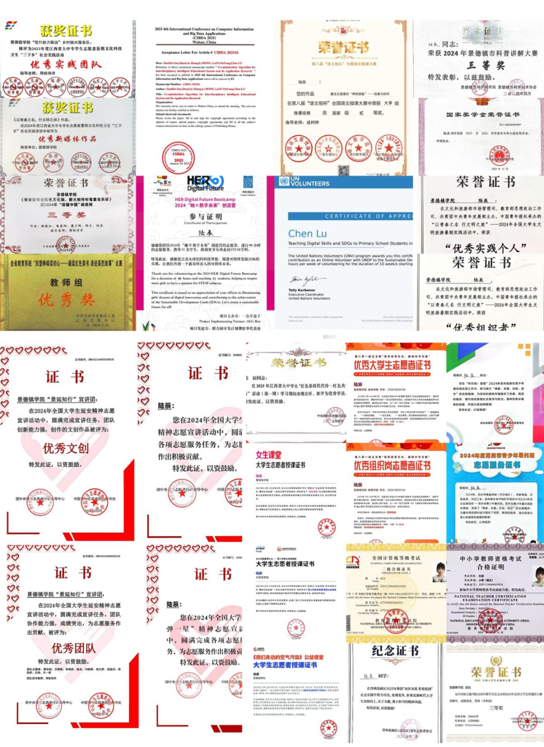 学海无涯,勤勉作舟。她连续两年专业绩点第一、综测排名班级第一,荣获“国家奖学金”“三好学生”等荣誉,在努力学好本专业的同时,也促进多学科交叉融合,荣获江西省“强国有我、青春有为”暑期社会实践活动二等奖、江西省“读懂中国”视频类三等奖、江西省“诵读红色家书,讲述英烈故事”优秀奖等83项证书,其中市校级及以上证书近70项,考取普通话二甲、教师资格证、syb等8项技能类证书。同时她在学术领域创新突破、拓展知识的深度与广度,荣获第八届“语文报杯”全国语文微课大赛大学组微课视频类国家级二等奖,在国际会议CIBDA发表核心论文1篇,论文被“香港教育大学-清华大学教育论坛”接受(第一作者)、在校报发表论文1篇,砥砺守正创新,在学海中奋楫求索。