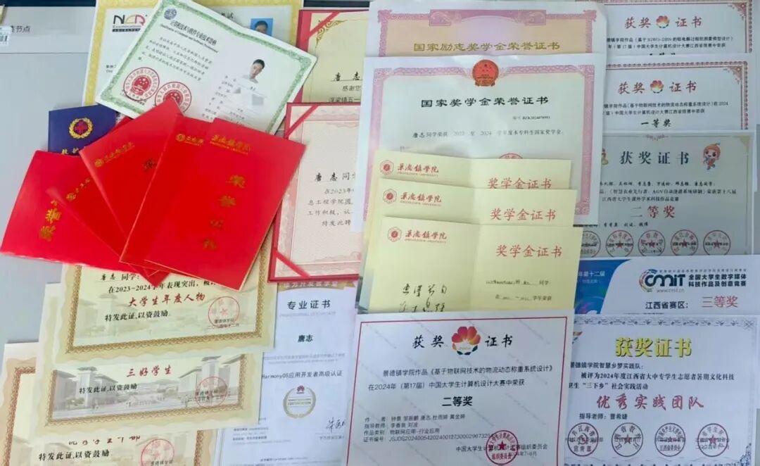 在校期间,唐志同学积极投身于各类学科竞赛的征途,一路披荆斩棘,摘得累累硕果。在学习方面,获得国家奖学金和多次校级一等奖学金,学科竞赛方面获得了第十八届“挑战杯”江西省大学生课外学术科技作品竞赛省级二等奖、2024年6月获2024年(第17届)中国大学生计算机设计大赛物联网赛道国赛“二等奖”和软件开发赛道省赛“三等奖”、参加大学生创新创业训练计划入选国家级项目、获得全国大学生数字媒体科技作品及创意竞赛江西省三等奖、2025年6月获2025年(第18届)中国大学生计算机设计大赛物联网赛道省赛“一等奖”和软件开发赛道省赛“一等奖”;2024年11月在 the 4th International Conference on Computer, Big Data and Artificial intelligence (lCCBD+Al 2024)发表学术论文一篇,获得软件著作权3项,申报专利2项。