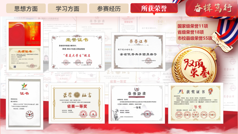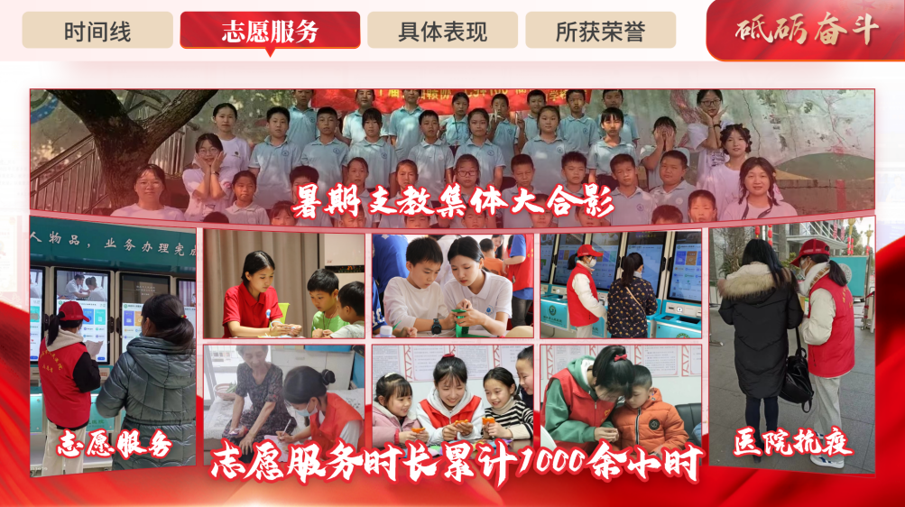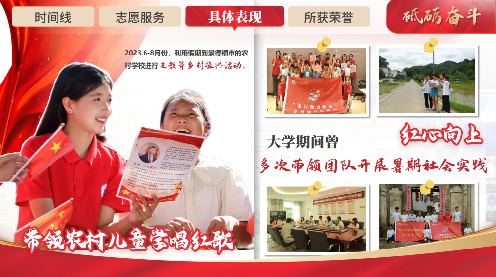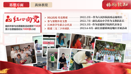 躬身躬行系家国,凭爱领航,秉烛启新程。在生活中,她热爱劳动,崇尚实干,热衷于志愿服务事业,长期利用假期和空余时间致力于志愿服务工作,在校期间先后积极参与2022年中国农民丰收节、2022年“推普助力乡村振兴”全国大中专学生暑期社会实践志愿服务、2022年江西省第十届“C9+100”高校赣籍学子暑期支教、2023年全国大中专学生志愿者暑期文化科技卫生“三下乡”社会实践“笃行计划”和“乡村振兴”专项等各种类型的志愿服务活动,累计志愿服务时长1000余小时。2022年暑期“推普助力乡村振兴”社会实践活动中,她所在的团队获得教育部、团中央表扬信表扬;2023年暑期,作为三支实践团队队长,她带领队伍制定行动指南,梳理三下乡社会实践流程,团队成员分工明确,共同协作,积极投身暑期“三下乡”社会实践,后续她将团队三下乡实践过程及成果形成报道,向中国青年网、学习强国等多个新媒体平台投稿,共计60余篇报道,团队获评团中央2023年全国乡村振兴“笃行计划”专项和“乡村振兴”专项实践活动“优秀实践团队”等多项荣誉。个人荣获团中央授予2023年全国暑期“三下乡”社会实践“优秀个人”、2022年江西省“返家乡”社会实践“优秀个人”、2023年江西省暑期“三下乡”社会实践活动“优秀个人”等多项荣誉。