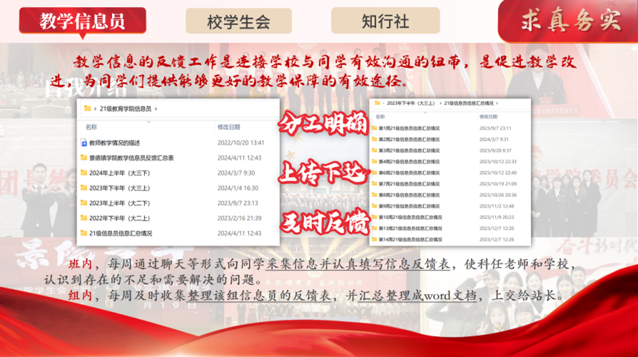 知行相济奉服务,倾忱筑梦,矢志达远岸。在工作上,戴方晴自2021年入学以来即加入了景德镇学院学生会,后任景德镇学院学生会主席团成员,任职期间,在老师和学长学姐的悉心指导与帮助下,她始终坚持全心全意为同学服务的宗旨,以饱满的热情、踏实的态度、务实的作风积极投身于每一项工作,想同学之所想,解同学之所难,立志服务好每一位同学,带领学生会组织开展各项活动获得了2022年江西省学联学生会组织“我为同学做实事”服务同学项目“发展之星”等荣誉,个人连续两年被评为景德镇学院“优秀学生干部”、“优秀共青团员”等荣誉称号。与此同时,她还担任了景德镇学院学生社团知行社社长,带领社团成员组织开展科普讲解大赛、师范生技能大赛等各项高标准、严要求的学术科技类竞赛,选送的选手代表学校分别前往景德镇市与江西省参加科普讲解大赛及“华文杯”等赛事,并取得了优异的成绩,社团也被评为2022年度江西省高校“活力社团”、2022-2023年度景德镇学院“十佳社团”等荣誉。