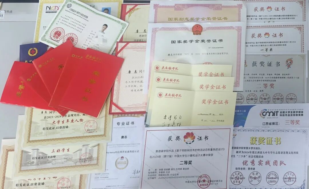 唐志,汉族,江西赣州人,共青团员,现为景德镇学院信息工程学院2022级计算机科学与技术2班学生,担任22计科2班班长,信息工程学院第十一届团工委书记。连续两年综合素质排名专业第一。曾获2022—2023年度、2023—2024年度校级一等奖学金,2023—2024年度国家奖学金,2024年(第17届)中国大学生计算机设计大赛物联网赛道国赛“二等奖”,第十八届“挑战杯”江西省大学生课外学术科技作品竞赛省级二等奖。获得三好学生、优秀志愿者、优秀团干等多项荣誉,参加志愿服务活动8项,志愿服务时长累计200小时,在2024年暑期三下乡活动中所在团队获得省级优秀实践团队荣誉。发表学术论文1篇,获得软件著作权3项。已获得全国大学生英语四六级证书、全国计算机二级、中级软件设计师证书等多项证书。